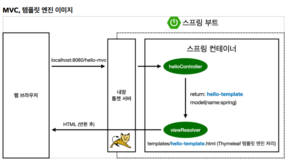 1. 웹브라우저 에서 localhost:8080/hello-mvc 를 넘기면, 내장 톰캣서버를 거쳐서 spring 에게 넘기고