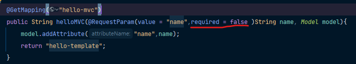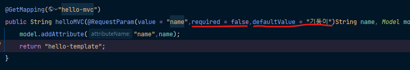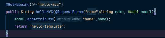 이번에는 메소드 내 @RequestParam을 통해 외부에서 파라미터를 받아보자. 리턴값은 hello-template 으로 하고,