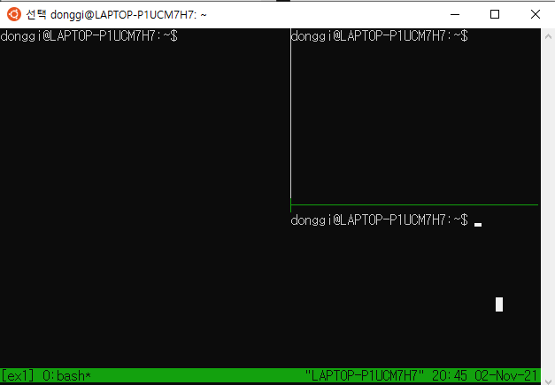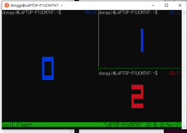 하나의 윈도우는 여러개의 팬(Pane)으로 분할해서 사용할 수 있다. 각각의 팬은 별도의 터미널처럼 동작할 수 있다. 즉, 1번 팬에서 vi를 열어서 소스코드를 보는 동시에 2번 팬에서 컴파일을 하고, 3번 팬에서 로그를 열어볼 수 있다.