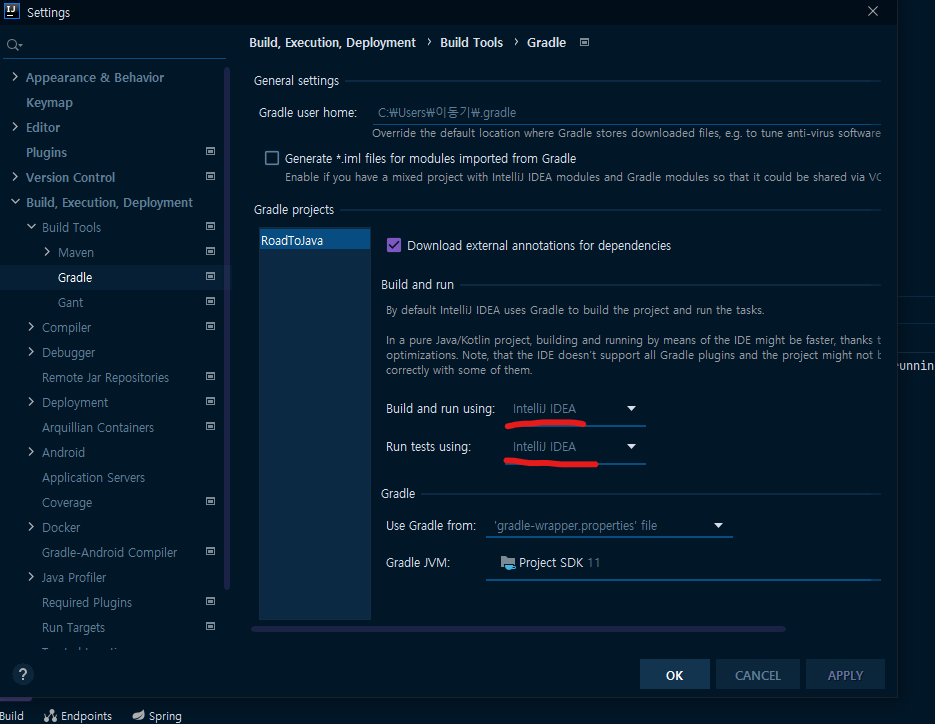 Build and run using 과 Run tests using 환경을 Intellij IDEA 로 설정후 실행