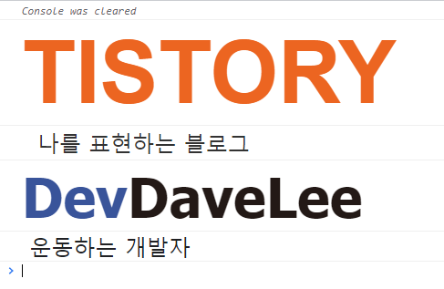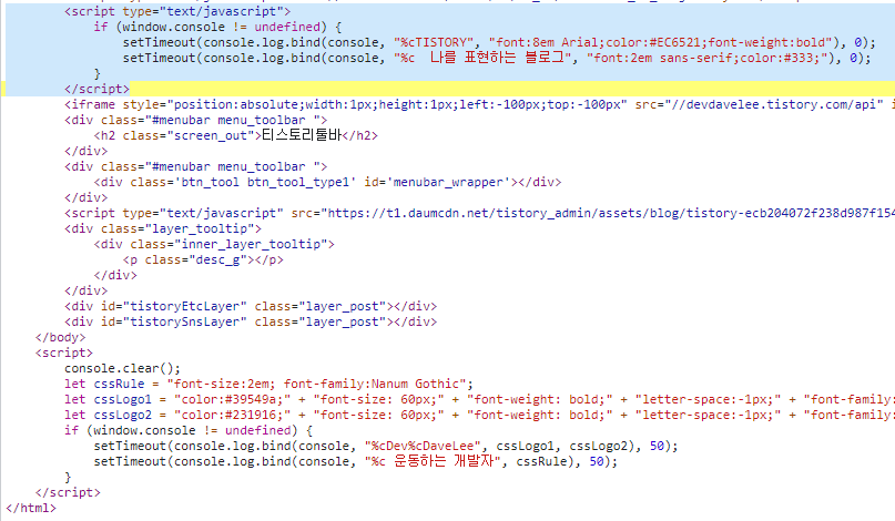 티스토리에서 개발자 도구( F12 ) 를 켰을때 콘솔창에 아래와 같이 로그가 이쁘게 나왔다.