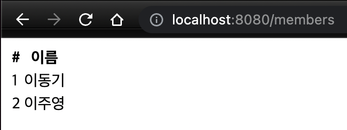 memberList.html 에서는 thymeleaf each 구문을 통해 members 리스트를 순회하며, 순회할때마다 id와 name을 가져 온다.