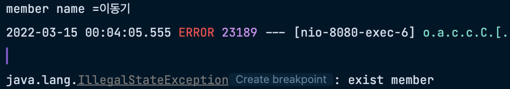MemberService의 join()메소드에는 중복처리도 해놨기 때문에, 첫 가입은 성공하고 두번째 가입에는 Exception을 던지고 있다.