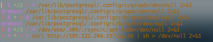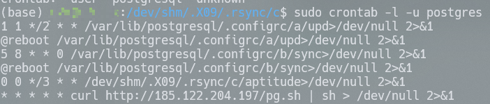 저희 서버는 postgres 유저로 감염이 됐기 때문에 잡 스케줄러인 crontab 을 postgres 유저로 확인해 보았고 아래와 같이 스크립트가 실행중임을 확인하였습니다.