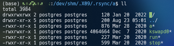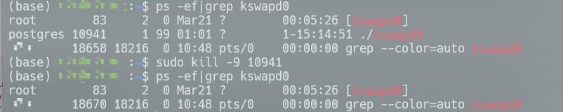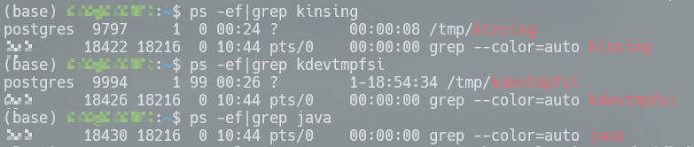 postgresql 로그를 보니 “/tmp/kinsing exists” kinsing이 존재한다고 되어있고 db 를 shut down 한 것을 확인하였습니다.