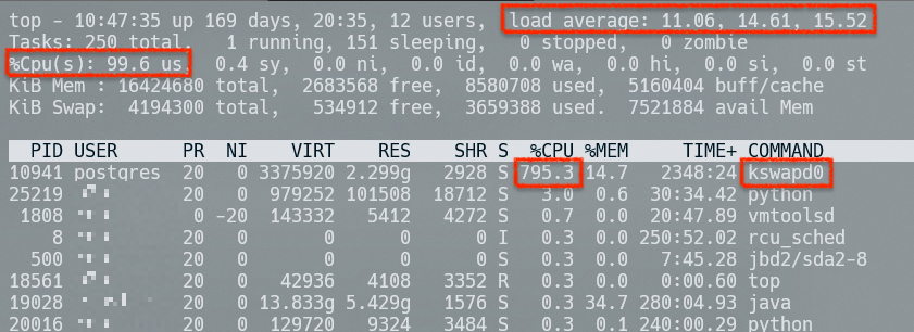 postgres 유저이름으로 돌아가는 프로세스 두 개(kdevtmpfsi , kswapd0)가 cpu 400% 가까이 올라가는것을 확인했습니다.
