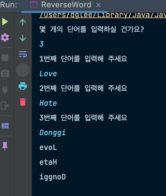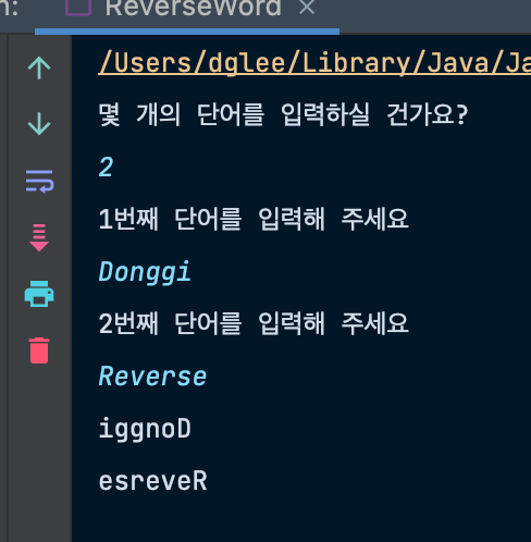 N개의 단어를 입력된 순서대로 한 줄에 하나씩 뒤집어서 출력합니다.