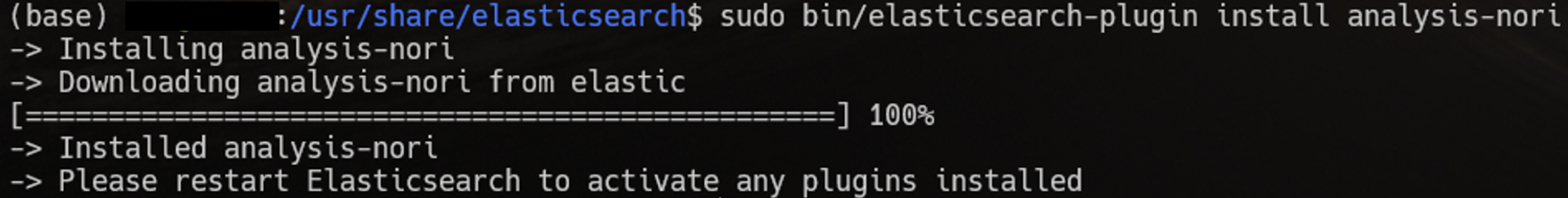 Nori 를 사용하기 위해서는 먼저 elasticsearch에 analysis-nori 플러그인을 설치해야 합니다. Elasticsearch 홈 디렉토리에서 다음 명령을 실행하면 버전에 맞는 nori 플러그인을 받아서 자동으로 설치합니다.