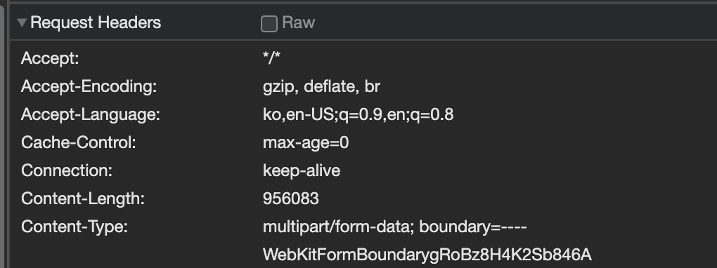 Fetch API의 Header부분 Content Type에 multipart/form 으로 직접 명시해서 요청을 보냈는데, 이렇게 하면 뒤에 boundary의 값이 없는 상태로 덮어씌워져 요청이 된다고 합니다.