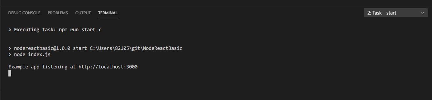 콘솔창(여기서는 Terminal) 에는 Example app ~~~ at localhost:3000 이 출력될 것이다!