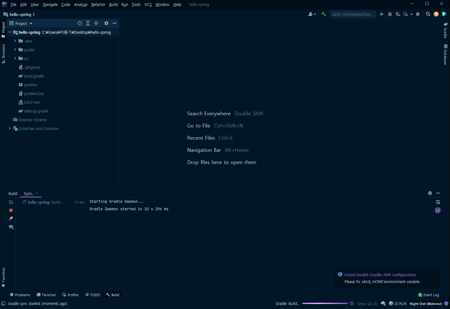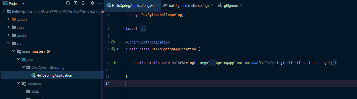 다음 과 같이 좌측 프로젝트란에 hello-spring이 제대로 배치된 것을 확인 할 수 있다.