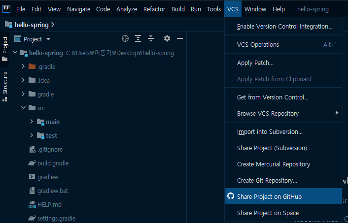 번외) IntelliJ 에서 원하는 프로젝트를 깃허브에 연동하기