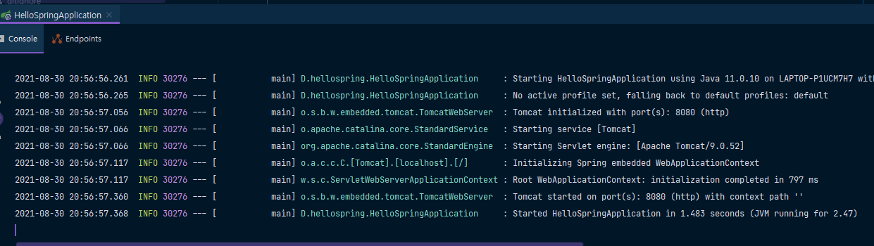 하단 콘솔창 로그와 localhost:8080 포트로 들어가서 확인해보자.